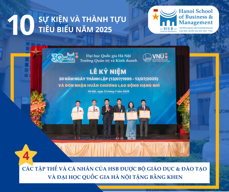 - Số lượng bài nghiên cứu khoa học tăng so với năm 2024 (Số lượng bài Q1,Q2 tăng 150%; bài WOS/Scopus tăng ~67%). Tất cả các bài báo quốc tế thứ hạng cao đều tiêu biểu và tiên phong theo 2 trường phái học thuật của HSB là IMB và MNS, phục vụ công các đào tạo, tư vấn, và chuyển giao tri thức mới.