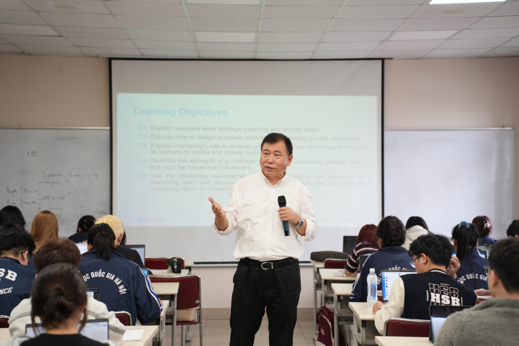 For postgraduate programs, Professor Zhan also participated in teaching and academic exchanges with students in the Research Methodology course. He shared insights on research design, methodology, and the process of developing MBA theses in accordance with international academic standards. In addition, he held in-depth discussions with international students of the HSB–MBA program on developing theses aligned with international scientific publication. The sessions focused on identifying research questions, exploring research gaps, building theoretical frameworks, and ensuring academic standards in conducting and presenting research results, thereby helping students enhance their research and academic writing capabilities.